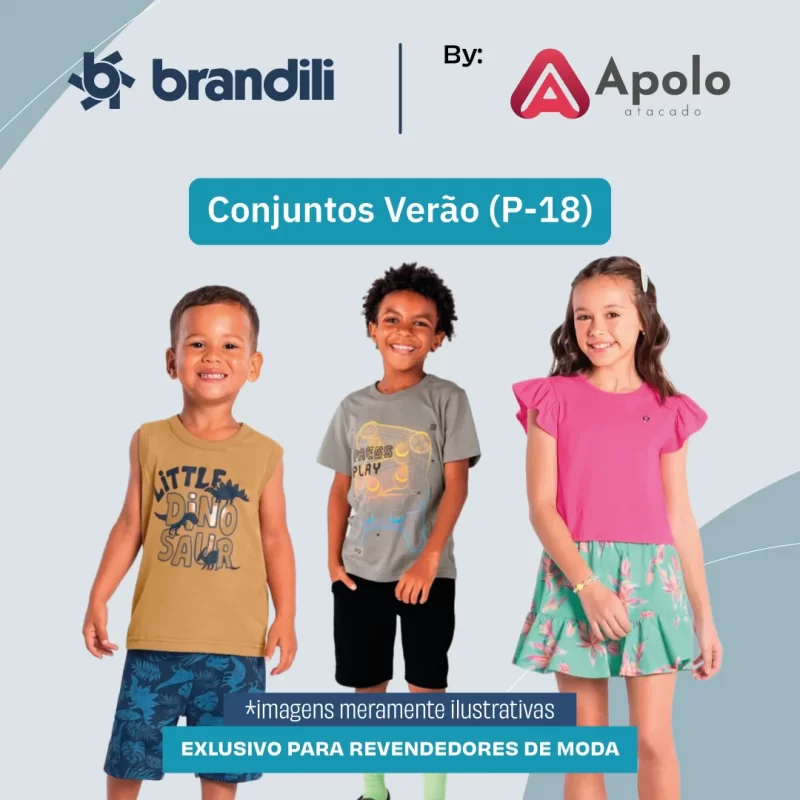 Brandili conjuntos verão com peças Mundi e Young saindo a R$ 36,90 cada peça. Grade: P ao 18, sendo 67% feminino e 33% masculino, distribuídos em: P ao 3: 30% | 4 ao 10: 47% | 12 ao 18: 23%. Vendido em kits com 30 peças por apenas R$ 1.107,00.
