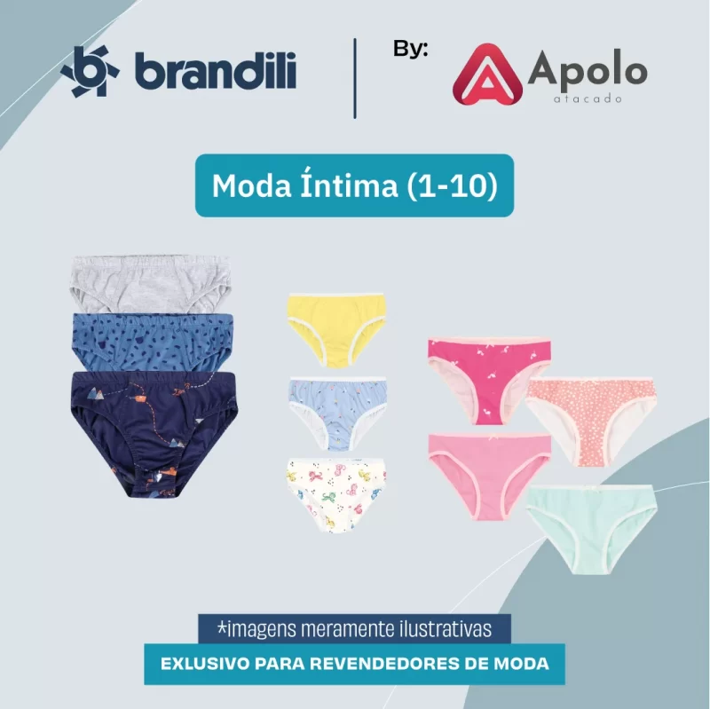 Kit moda íntima Brandili com modelos de cuecas e calcinhas saindo a R$ 9,90 cada peça. Grade P ao G ( sendo P= 1 a 3 anos), M (4 a 6 anos) e G do 8 ao 10 - imperdível!! Modelos com malha e cotton, super confortáveis, elástico reforçado, cores e estampas que são uma graça! Vendido em kits com 15 peças por apenas R$ 148,50.