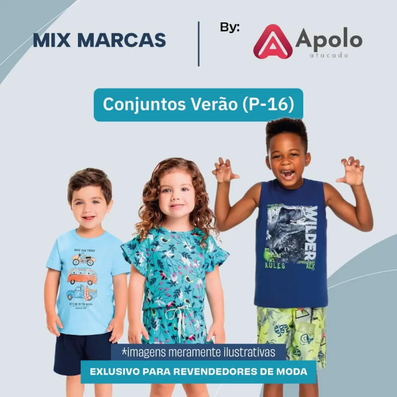 Opção especial para quem procura marca de moda infantil renomada. Conjuntos saindo a R$ 39,90 cada! Grade: P-16, com 60% masculino e 40% feminino, 37% Elian, 27% Rei Rex e Kely Kety, 23% Brandili e 13% Alakazoo Lunender. Vendido em kits com 30 peças no valor de R$ 1.197,00.