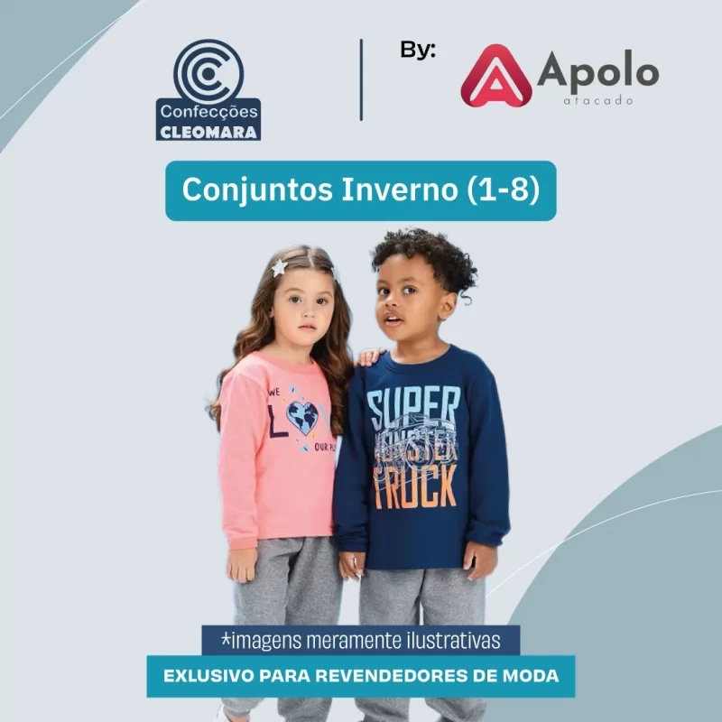 Opção perfeita para o dia a dia, conjuntos Cleomara com peças saindo a R$ 19,90 cada! Grade: 1 - 8, 47% do 1-3 e 53% do 4 ao 8. Modelos super divertidos confeccionados com 85% algodão e 15% poliéster. Kit vendido com 30 peças saindo a R$ 597,00.