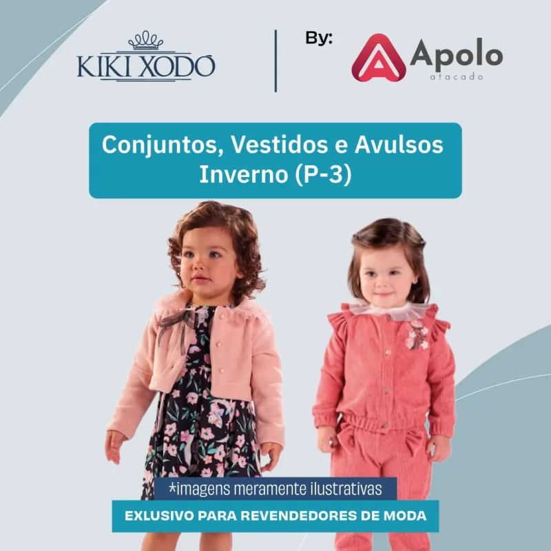 Procurando Kiki Xodó para sua Loja? Peças Maravilhosas saindo a R$ 49,90 cada peça. Com 50% na linha bebê e 50% nos primeiros passos. Grade: P -3, distribuído em: 36% conjuntos, 31% de vestidos, 17% peças superiores e 17% inferiores. Kit vendido com 18 peças saindo a R$ 898,20.