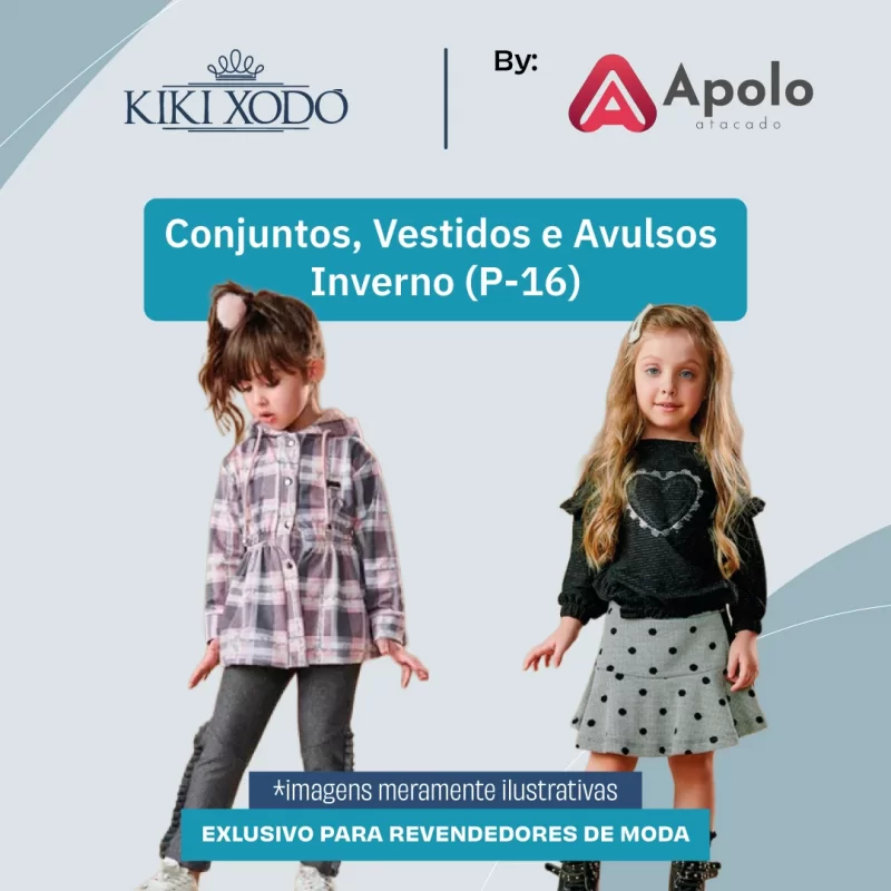 Atenção Lojistas e Revendedores: Novidade imperdível Kiki Xodó para este inverno com peças saindo a R$ 59,90 cada. Grade: P - 16, sendo composto por: 68% superiores, 16% inferiores, 12% de conjuntos e 4% vestidos, sendo: 72% Juvenil 12% infantil 10% Primeiros passos e 6% linha bebê. Kit vendido com 25 peças saindo a R$ 1.497,50.
