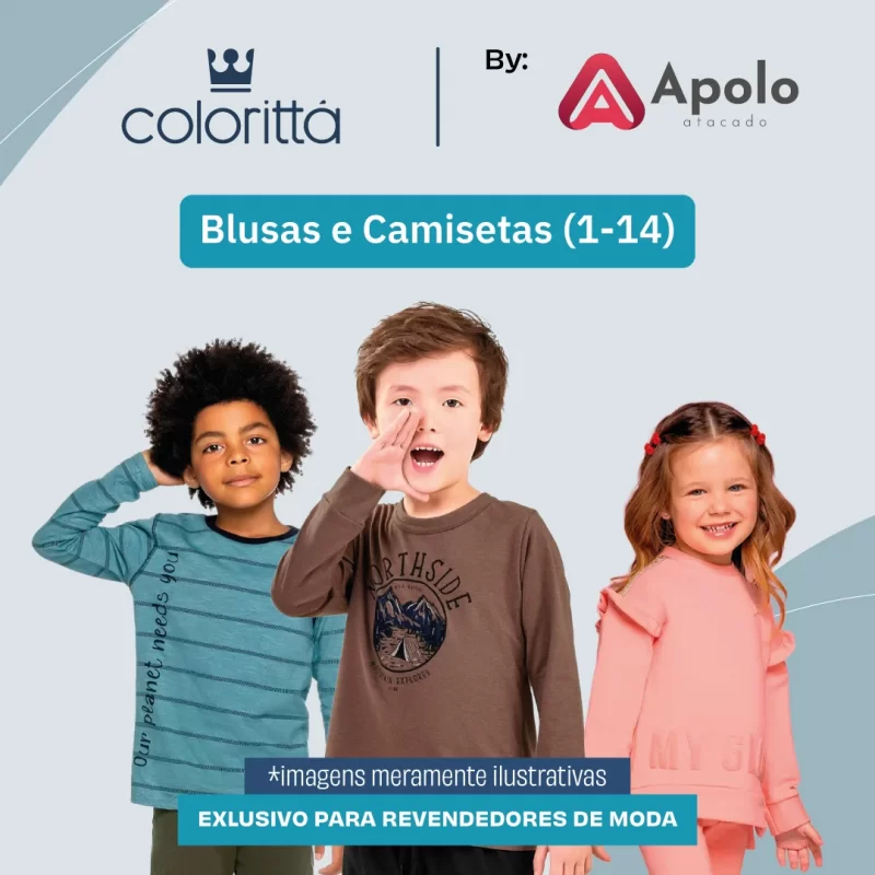 Monte looks incríveis com as peças avulsas do inverno leve Colorittá! Camisetas e blusas com muito charme saindo a R$ 21,90 cada peça. Grade: 1-14, distribuídos em 67% feminino e 33% masculino: 27% 1 ao 3, 56% 4 ao 10, 17% 10 ao 14. Vendido em kits de 30 peças por apenas Kit R$ 657,00.