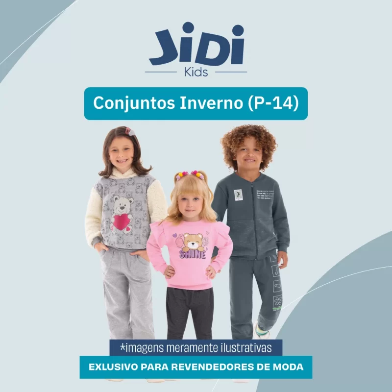 Lançamento imperdível Jidi Kids Kit conjuntos inverno em moletom com peças super quentinhas e com designer moderno. Tam: P ao 14 - Venda na grade 1/1/1 com referências e cores sortidas. Preço: R$ 34,90 cada conjunto. Prazo: 60 dias médio ou cartão em 4 vezes sem juros. Frete CIF Ped. Consulte diretamente com nossas consultoras Prazo de fat.: De 5 a 7 dias