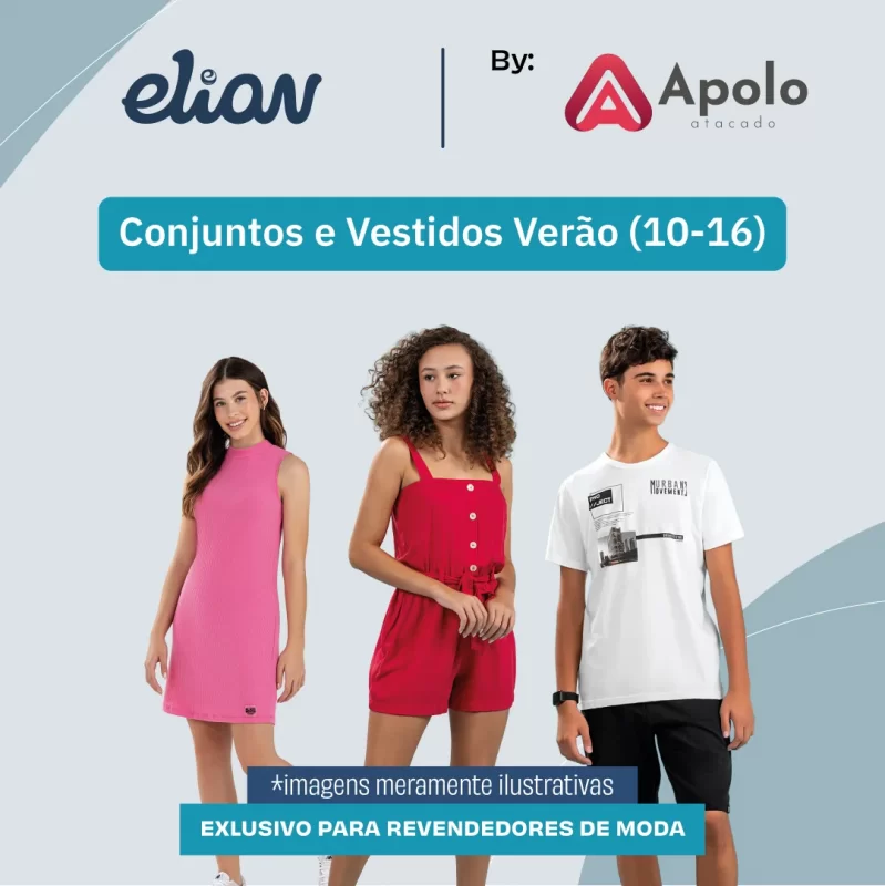 Mais uma super opção para você lojista que procura moda juvenil. Elian conjuntos e vestidos saindo a R$ 39,90 cada peça. Grade: 10 - 16. Oportunidade com 77% conjuntos e 23% vestidos. Maior índice em peças na linha feminina. Vendido em kits com 30 peças no valor de R$ 1.197,00
