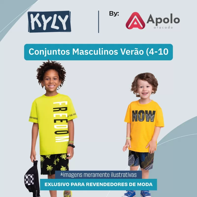 Para quem procura moda para revenda com qualidade, marca renomada, design moderno: Kyly conjuntos com peças saindo a R$ 34,90! Grade: 4-10, sendo 57% camisetas e 43% Regatas, distribuído em: 32% em cada tamanho 4, 6 e 8 e 4% no tamanho 10. Vendido em kits com 28 peças no valor de R$ 977,20.
