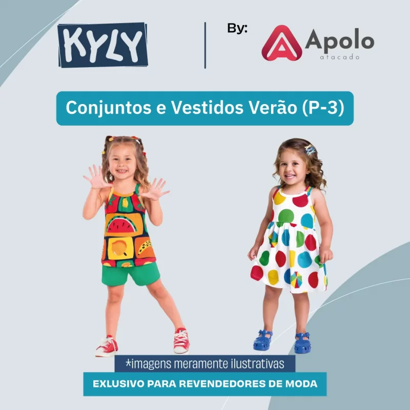 Procurando conjuntos e vestidos na linha bebê para encantar suas clientes?? Kyly 100% feminino saindo a R$ 29,90 cada peça. Grade: P-3, com 73% de conjuntos e 27% Vestidos, contendo 53% P ao G e 47% 1 ao 3, peças super fofas e charmosas. Vendido em kits com 30 peças no valor de R$ 897,00.