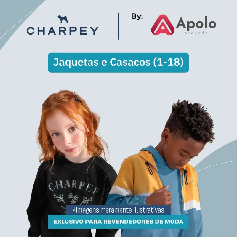 Lançamento Charpey!!com jaquetas e casados a R$ 69,90 cada peça. Use a criatividade e deixe seus clientes apaixonados com a sua vitrine. Grade do 1 ao 18, distribuído em 59% modelos no masculino e 41% feminino, sendo: 70% com zíper e 30% fechados. Kit vendido com 22 peças saindo a R$ 1.537,80.