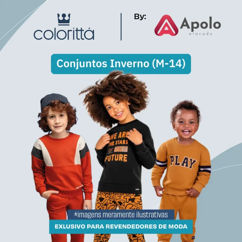 Super opção Colorittá com conjuntos inverno saindo a R$ 49,90 cada peça. Grade: M - 14 - distribuído em: 15% Bebê 23% Primeiros Passos 35% Infantil 27% Juvenil Dividido em 69% feminino e 31% masculino. Kit vendido com 26 peças saindo a R$ 1.297,40.