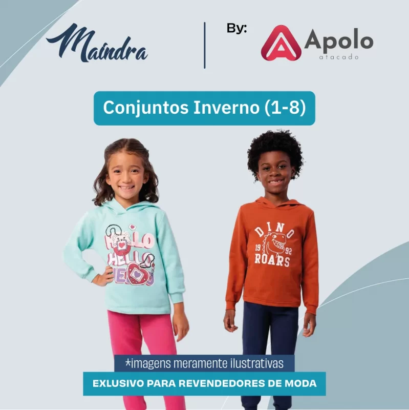 Procurando moda popular para vender muito neste inverno? Aposte com os conjuntos Maindra saindo a R$ 22,90 cada peça. Grade: 1 - 8, sendo 50% 1 ao 3 e 50% 4 ao 8 - também distribuído com 50% feminino e 50% no masculino, estampas super fofas! Kit vendido com 24 peças saindo a R$ 549,60.