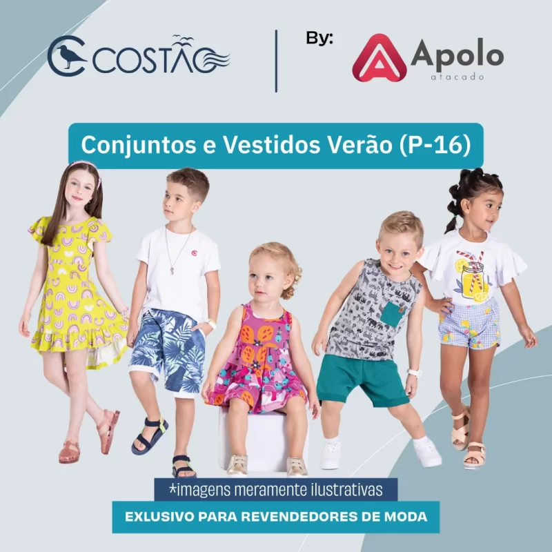 Costão com mix de peças para você lojista e revendedor que quer lucrar muito! São conjuntos e vestidos com muito estilo e conforto na grade do P ao 16 saindo a R$ 34,90 a peça. Vem distribuído em 57% feminino e 43% masculino, com modelos que vão te surpreender, conta com a linha para passeios, e também mais elaborada com mix de modelos e cores quesão a cara do Verão. Estampas com glitter, fio lurex, camuflado de folhas, estampas nas costas, temática de praia e street wear, modelos bem conceituais que são venda fácil!